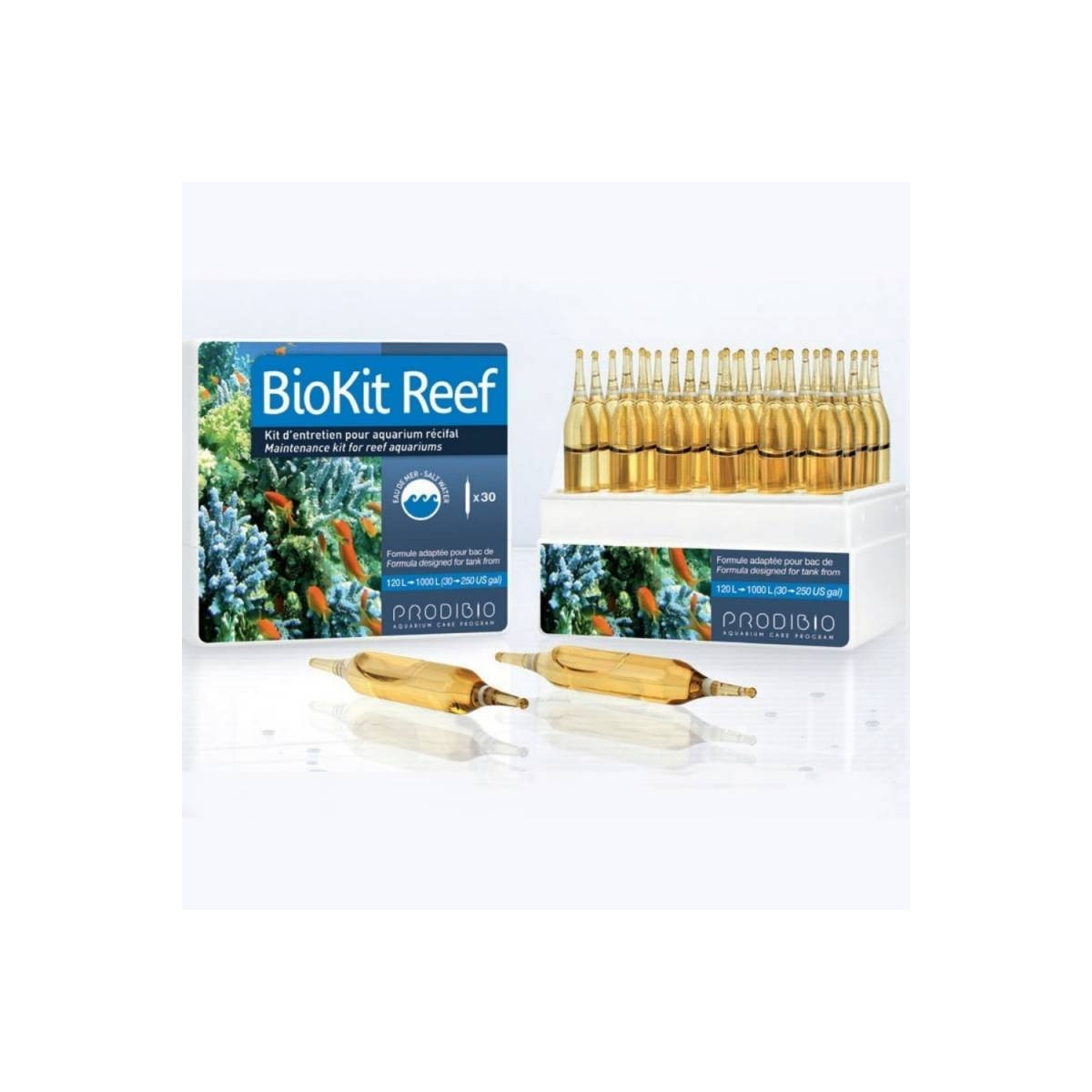 BioKit_Reef combina os produtos necessários para manter um tanque de recife: BioDigest (bactérias vivas), Bioptim (micronutrientes), Reef_Booster, Iodi + e Stronti + (suplementos de coral e rocha viva). Ampolas 30.