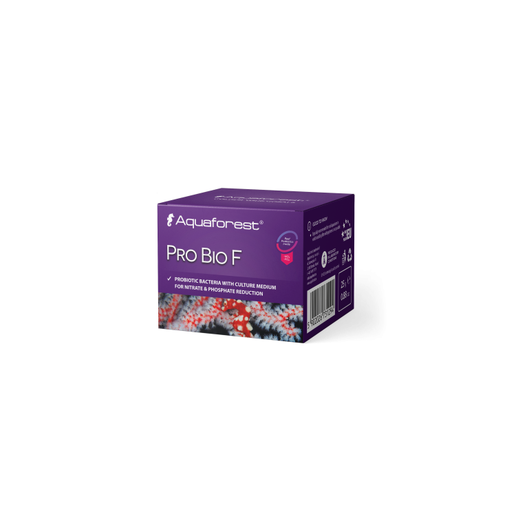 O produto contém uma composição única de bactérias probióticas liofilizadas e nutrientes para facilitar sua multiplicação. Pro Bio F é especialmente recomendado para pequenos aquários onde a instalação de um filtro de polímero não é possível ou é muito mais complicada. Pode substituir a administração de VSV ou outras fontes de carbono. A composição única de cepas de bactérias probióticas especialmente selecionadas foi desenvolvida para acelerar a decomposição da matéria orgânica. Melhora a limpidez da água e favorece a limpeza do substrato. O uso de Pro Bio F reduz a quantidade de nitrato a um nível indetetável, proporcionando ao coral condições de vida perfeitamente equilibradas e excelente coloração.