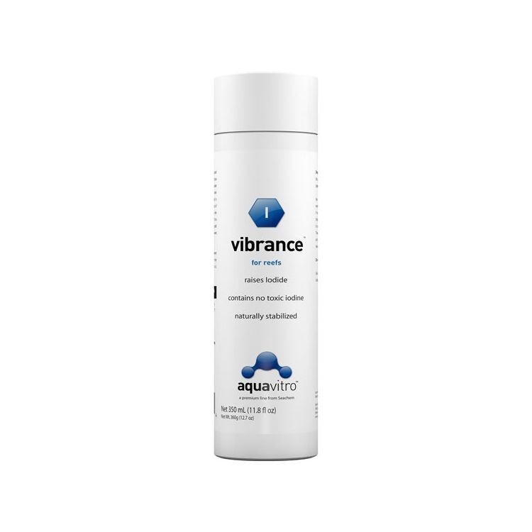 Aquavitro® VIBRANCE™ é uma fonte altamente concentrada (10.000 mg/l) de iodeto de potássio naturalmente estabilizado para aquários de recife. Pode aumentar e manter os níveis de iodeto (não contém iodo tóxico) como encontrado na água do mar natural. É o suplemento de iodeto mais estável do mercado.
