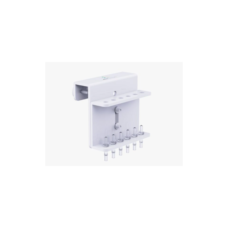 Suporte acrílico para fixar até seis tubos de dosagem regulável em altura, inclui pinos de fixação.