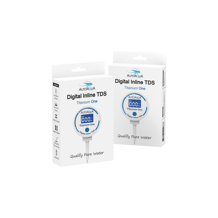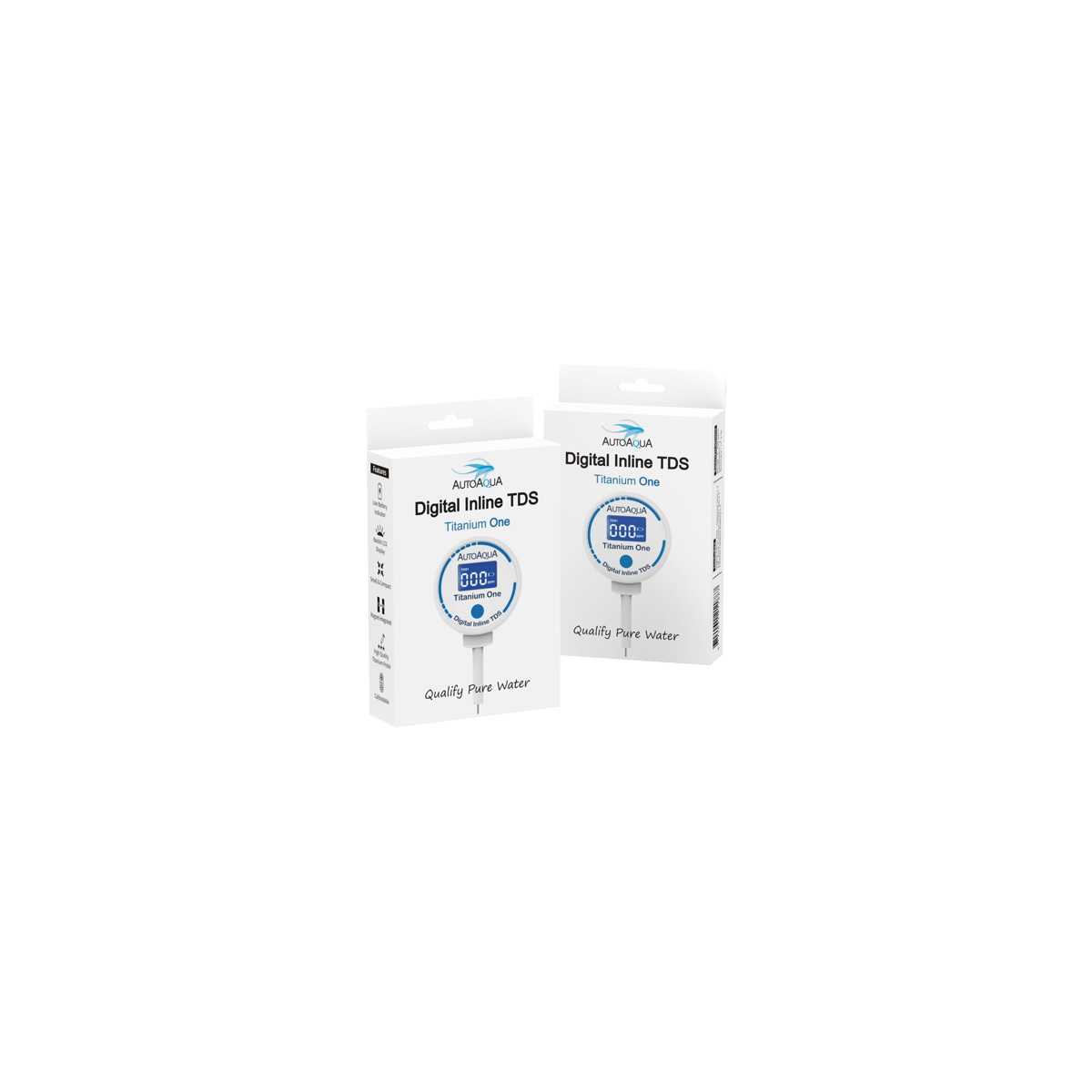 Titanium One é o menor medidor de TDS em linha disponível no mercado. Ele usa sonda de titânio, que apresenta excelente resistência à corrosão. É muito fácil de instalar com um ¼ ”Push Connect Union Tee (incluído). Além disso, é calibrável para resultados precisos. Após 3 minutos sem uso, ele desligará automaticamente para conservar a vida útil da bateria.