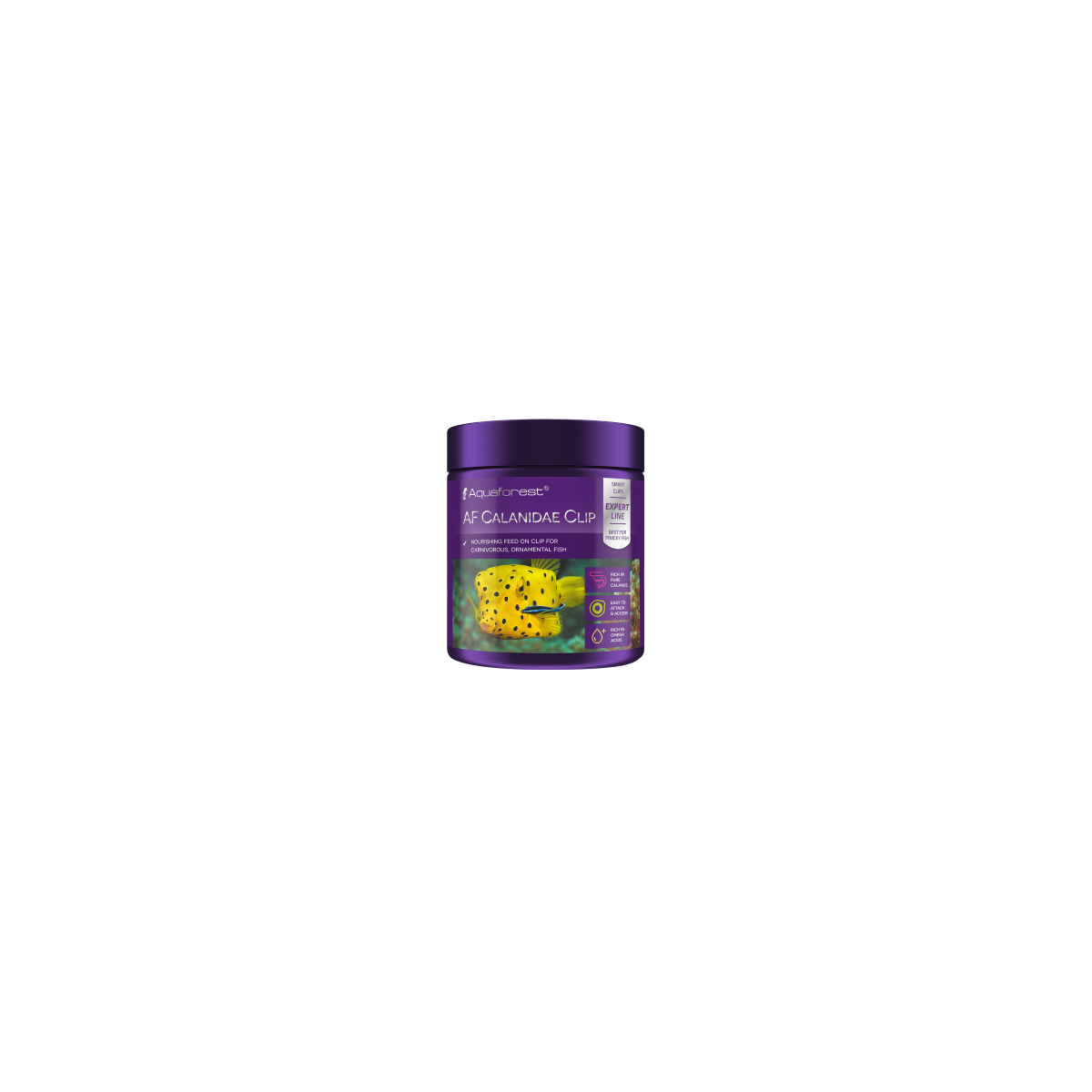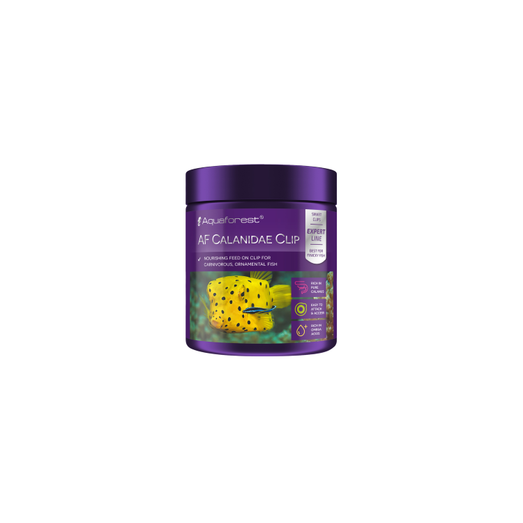 Alimento altamente nutritivo para todos os peixes pequenos. Contém Calanus finmarchicus, que é rico em aminoácidos. Graças ao alto teor de ácidos gordos EPA, DHA, SDA e algas, é o complemento perfeito para a dieta de todos os peixes marinhos. A comida é colocada no clipe, que pode ser pendurado em qualquer lugar do aquário, dando liberdade ao peixe para nadar e comer. O AF Calanus Clip é ideal para peixes que precisam aprender a comer alimentos secos, por exemplo Synchiropus splendidus, chelmon rostratus. A aplicação deste produto é apenas para aquários. Não é adequado para consumo humano. Mantenha fora do alcance de crianças.