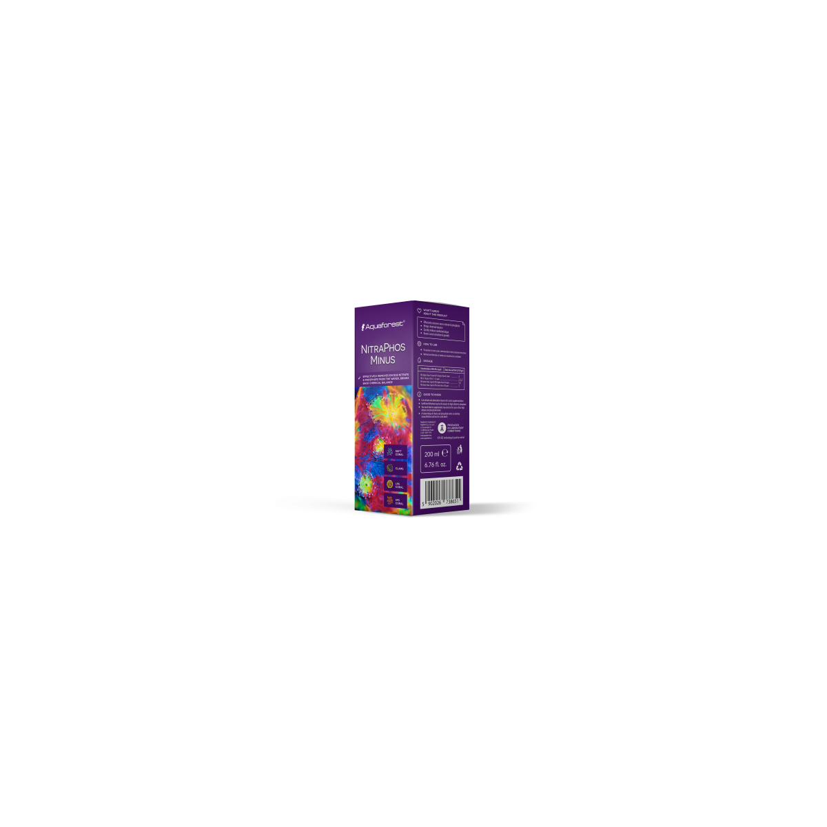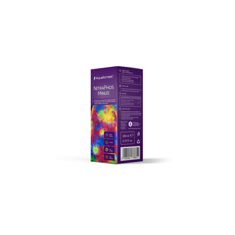 NitraPhos Minus é uma fórmula única que visa remover biologicamente nitrato, nitrito e fósforo do aquário. Ativa o metabolismo em vários tipos de bactérias, que são responsáveis ​​pelo manuseio e eliminação do excesso de nutrientes. Graças à composição especial de múltiplas formas de carbono orgânico, aminoácidos e vitaminas, todas as mudanças bioquímicas ocorrem sem problemas e os compostos são facilmente absorvidos pelas bactérias para convertê-los em biomassa. Essa biomassa torna-se alimento valioso para os corais, enquanto o excesso e seus resíduos são retirados da água por meio de filtros ou skimmers. NitraPhos Minus melhora o estado geral dos corais, proporciona uma melhor coloração e promove o seu crescimento. Devido à manutenção do equilíbrio biológico no tanque, evita a formação de algas verdes indesejáveis ​​e o desenvolvimento de cianobactérias.