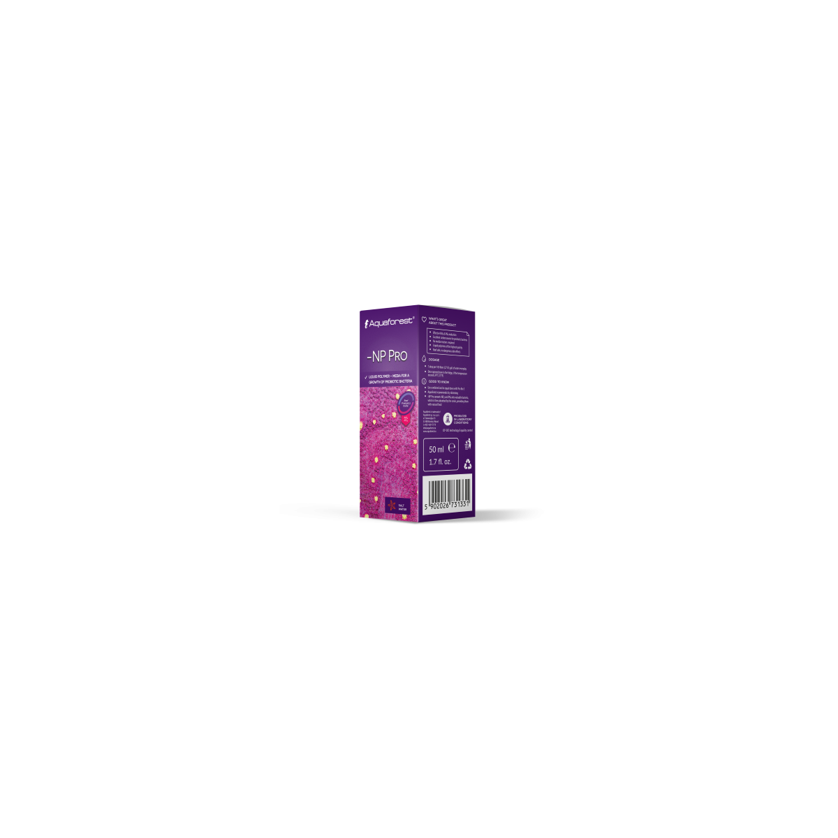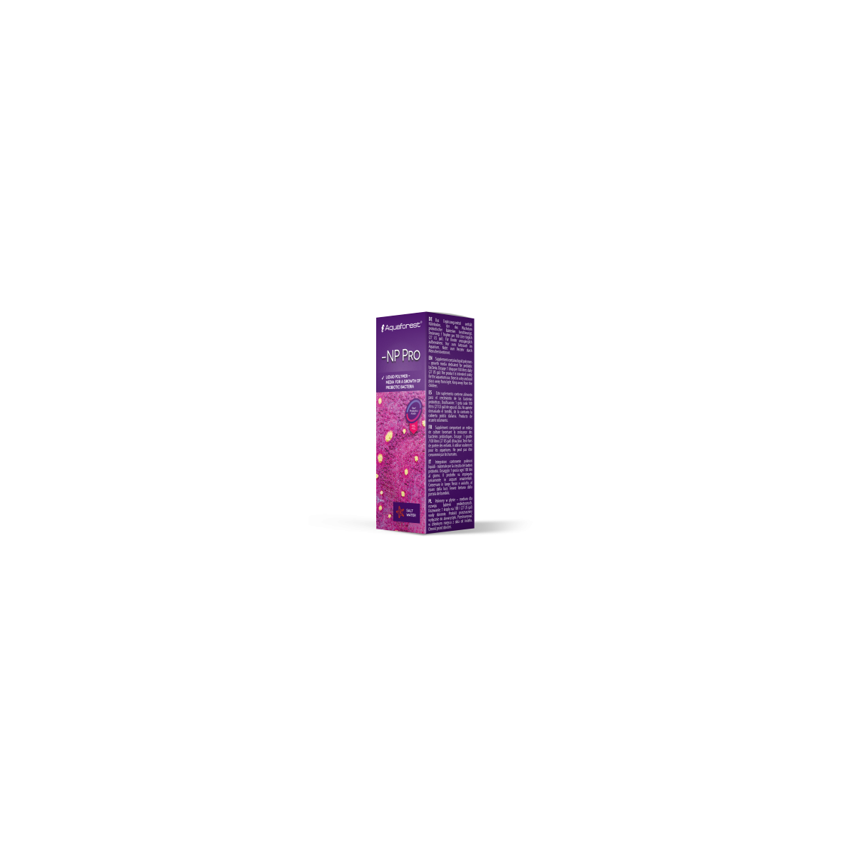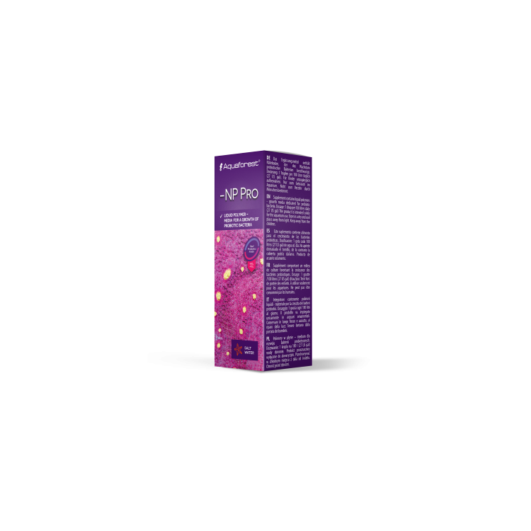 Polímero Líquido – meio para o crescimento de bactérias probióticas. Após a adição de NP Pro, as bactérias crescerão rapidamente e converterão nutrientes indesejáveis como nitrato e fosfato em biomassa. Como resultado, as bactérias serão retiradas pelo skimmer ou absorvidas pelos corais e filtradores, fornecendo assim outra fonte natural de alimento.