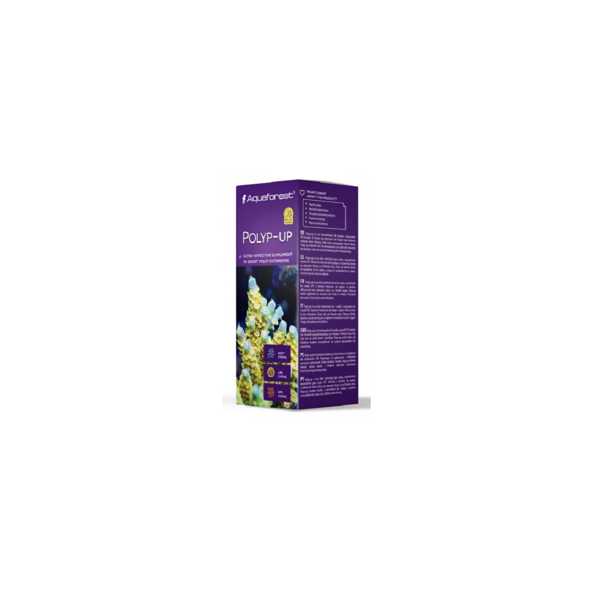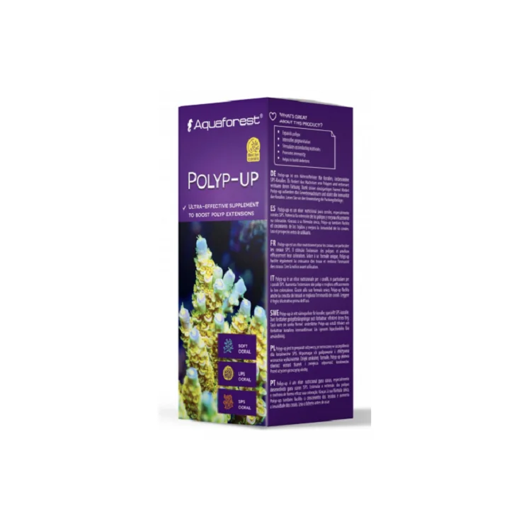 O Polyp-up é um excelente suplemento nutricional para corais, especialmente corais SPS. Melhora a aparência das extensões de pólipos e a sua tonalidade. Graças à sua fórmula única, o Polyp-up também facilita o crescimento dos tecidos e melhora a imunidade dos corais.