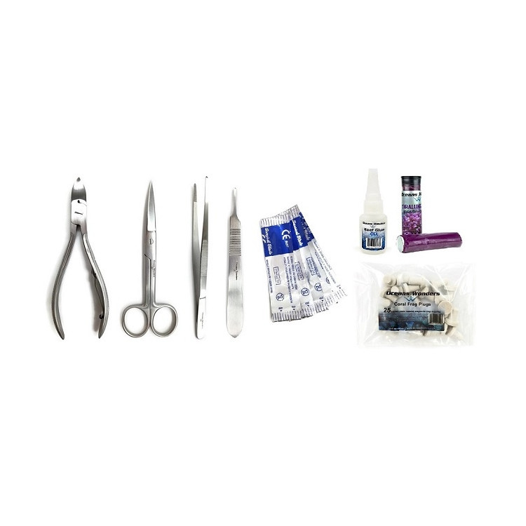 Inclui: alicate, tesoura, pinça, cortador com 5 lâminas, tudo em aço aço inoxidável cirúrgico. + Reef Glue Gel e Coralline Purple Reef Epoxy.
