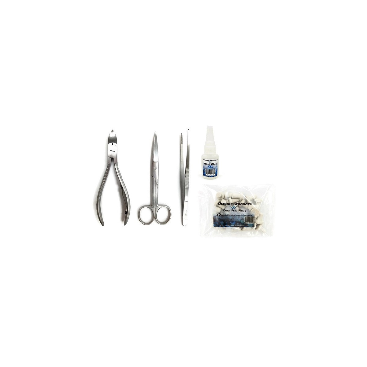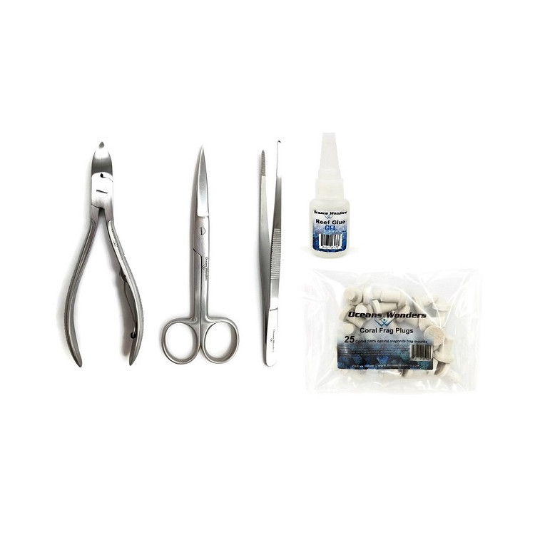 Inclui: Alicate de coral duro, tesoura de coral macio, Pinça (toda em aço inoxidável cirúrgico) e Reef Glue Gel