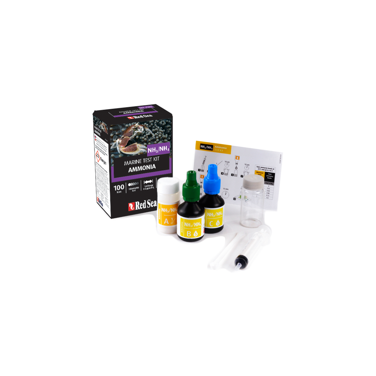 O kit marinho de teste marinho de amônia Red Sea é um teste colorimétrico avançado que mede a amônia total (NH 3 / NH 4 ) em aquários marinhos com uma precisão de 0,2 ppm.