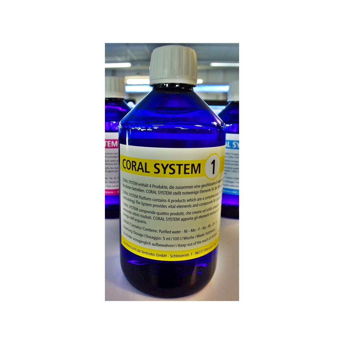 Coral System adiciona os elementos mais importantes e necessários para melhorar a coloração, a saúde e a biologia dos corais. Não contém cálcio, carbonato, magnésio, estes valores principais devem ser medidos regularmente e opcionalmente adicionados separadamente.
