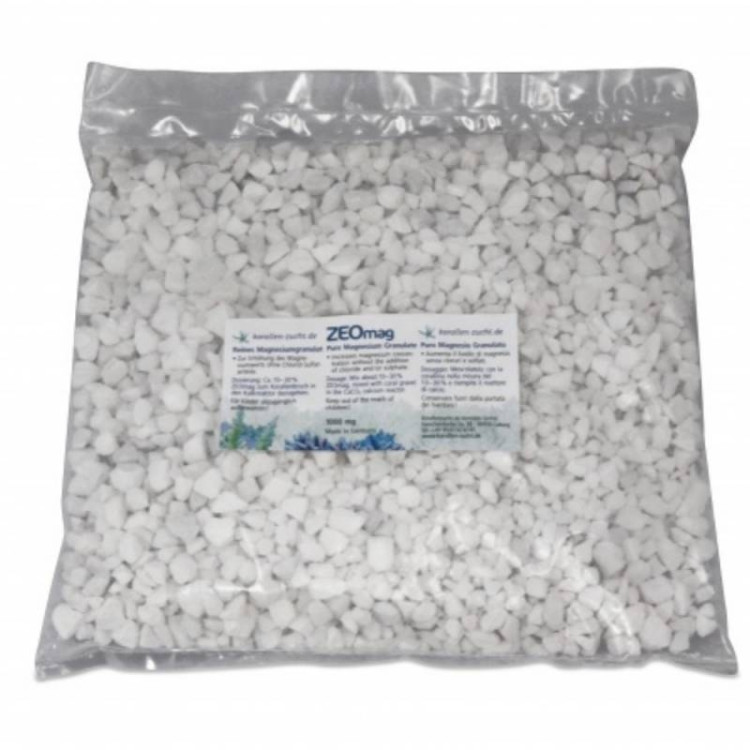 ZEOmag é um granulado de magnésio puro. Misturar com 10 - 30 % de cascalho de coral e colocar no reator de cálcio. Granulometria grossa 6 - 12 mm.