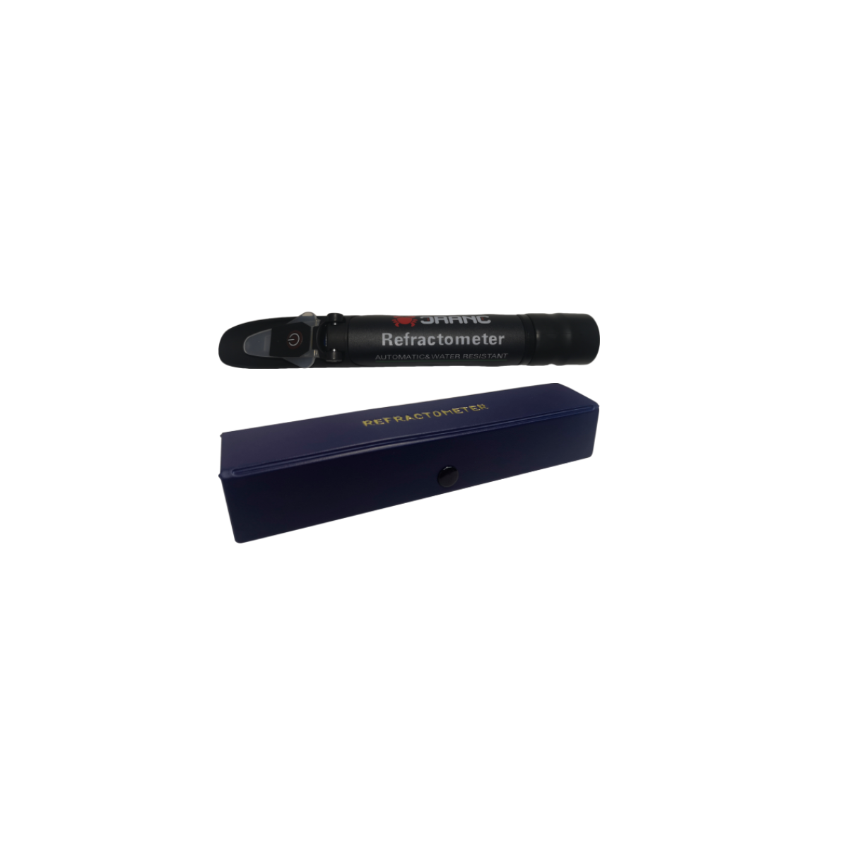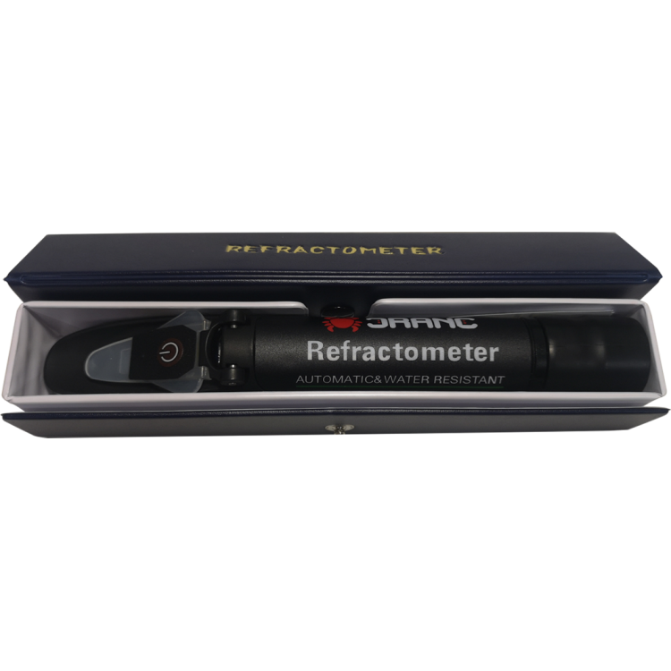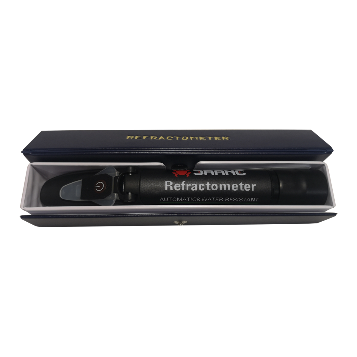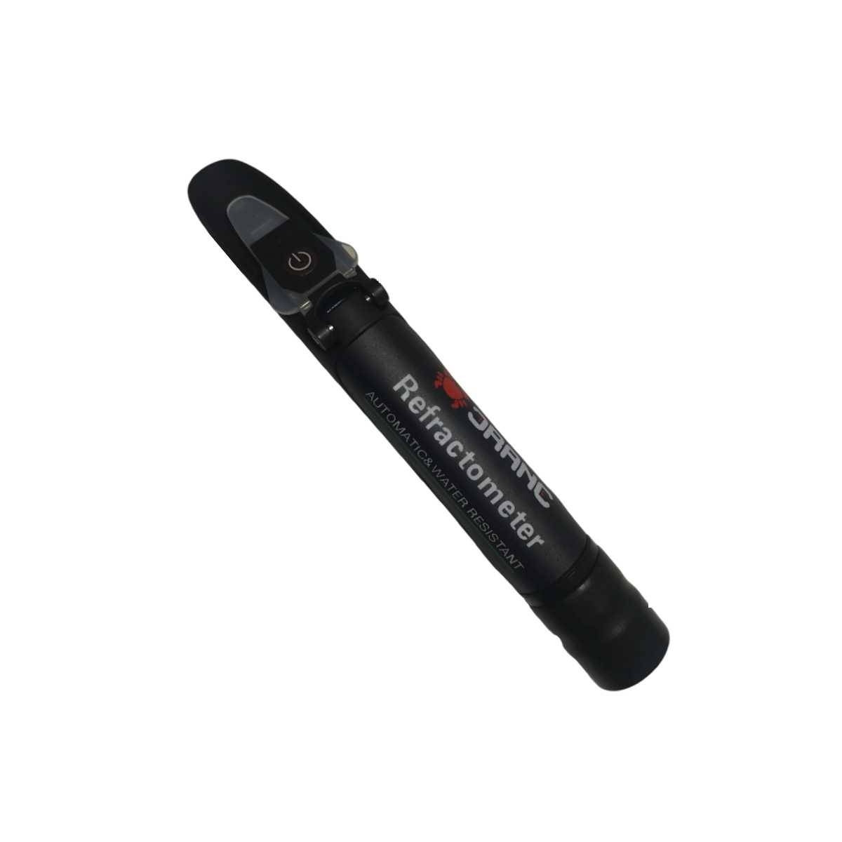 Refratómetro com LED embutido para verificar a salinidade da água. Precisão: 0-10% 1.000-1.070RI. Com função ATC (Compensação Automática de Temperatura). Inclui caixa de proteção.