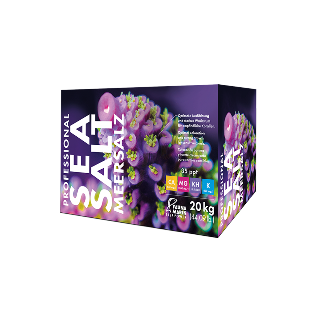 Professional Sea Salt contém todos os macro e oligoelementos importantes nas quantidades relativas corretas que refletem o mais próximo possível a mistura que ocorre na água do mar natural e fornece aos seus corais todos os minerais essenciais em forma bioativa. Professional Sea Salt foi especialmente desenvolvido para criadores de corais e aquaristas com os mesmos padrões profissionais.